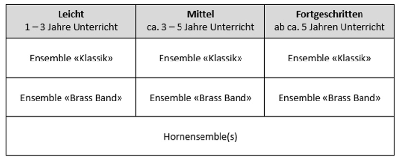 Für den Nachmittag meldet man sich in eines der Niveaus «leicht», «mittel», «fortgeschritten» der klassischen Ensemble-Formationen «Klassik» bzw. «Brass Band» an: